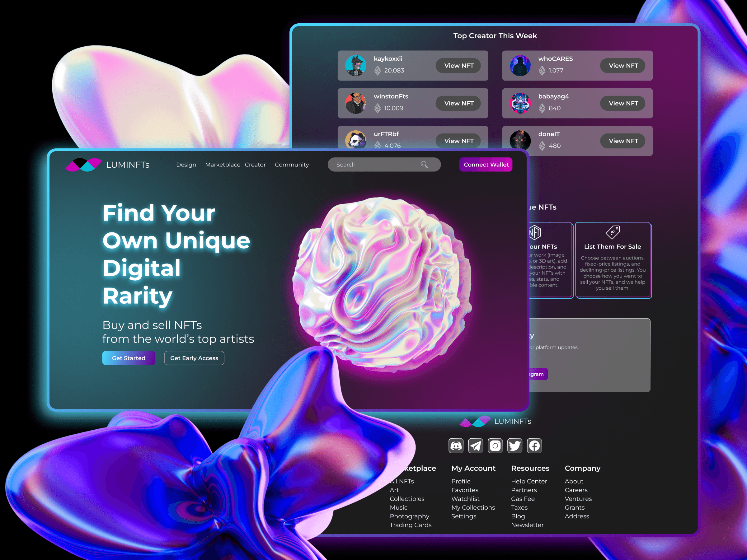 NFT marketplace landingpage, Discover exclusive digital art on LuminFTs. Each NFT is a unique masterpiece, creating unforgettable collecting experiences. Explore the world of digital creativity!